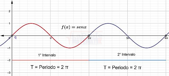 La función$$f(x)=senx$$es un ejemplo perfecto de una función periódica. Su periodo es de 2π, lo que significa que la forma de onda se repite en intervalos de igual longitud, es decir, 2π. Observa la gráfica: