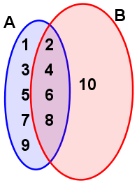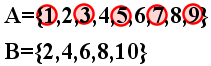 A={1,2,3,4,5,6,7,8,9} ∧ B={2,4,6,8,10}