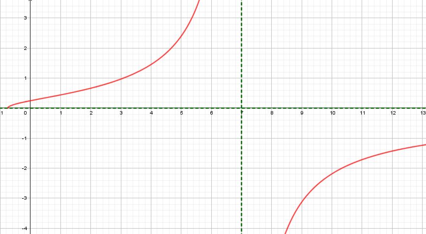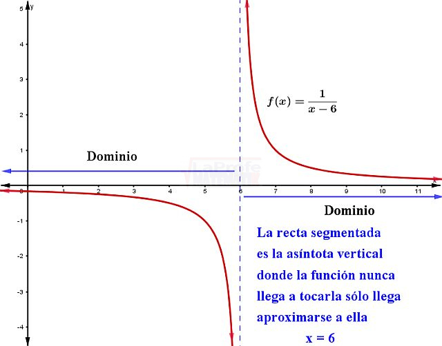 | 4 | Observaciones | Existe una asíntota vertical, esto quiere decir que el dominio de la función es todo el conjunto de los números reales menos el 6 ya que la curva nunca llega a tocar la asíntota sólo se aproxima a ella. |